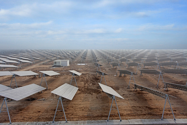 寧夏中衛(wèi)并網(wǎng)光伏電站總規(guī)模:太陽能光伏電池組件裝機容量共60MWp,一二期電站工程采用恩菲自主研發(fā)的8°角斜單軸智能柔性聯(lián)動追日跟蹤系統(tǒng),于2011年12月并網(wǎng)并投入運營;三期電站工程采用固定式支架安裝方式,于2013年1月并網(wǎng)并投入運營。